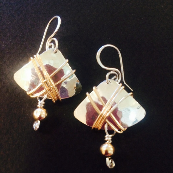 A hammered sterling silver disc with 14kt gold-filled wire wrap and is attached to hand-crafted french ear wires that have 5-millimeter bead dangles.