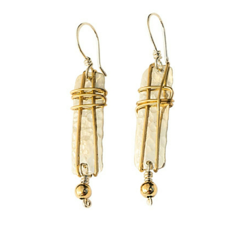 A wonderfully simple design.  Hammered rectangles hanging from handcrafted french ear wires with 14kt gold-filled wire wrapped selectively around the discs.  Each pair turns out different and is “one of a kind.”  These earrings make a great addition to your wardrobe.