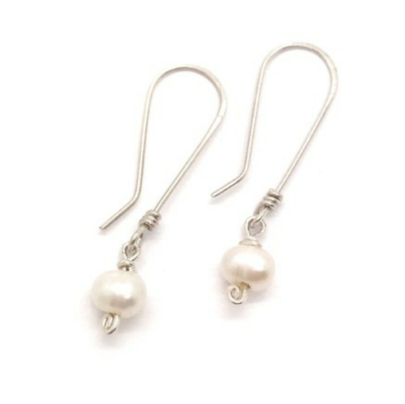 A simple freshwater pearl drop earring hanging from a long sterling silver handmade long hammer french back ear wire 1” in length