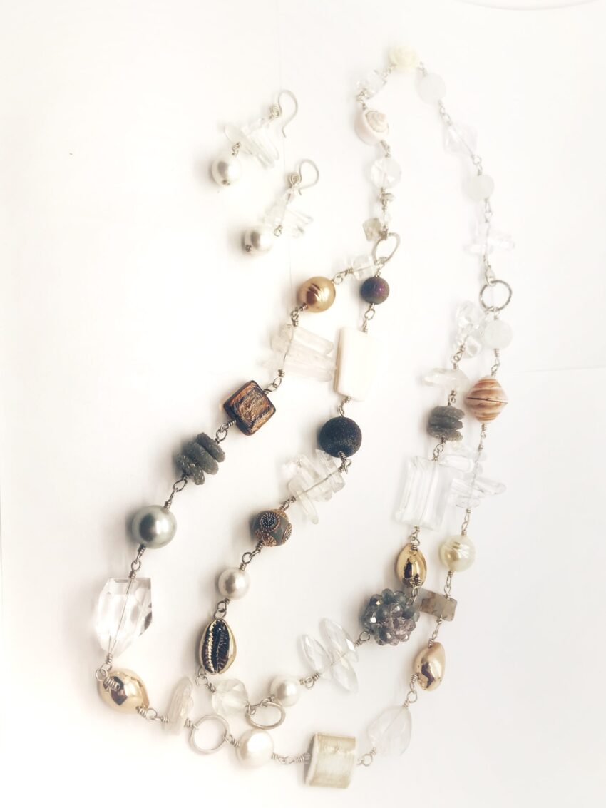 Wendy designed this necklace a few years ago and it has become quite popular! It’s called her “Perfect Necklace.” It is 3 necklaces in one. The only one you need if you are traveling. This is the Pearl version. The first necklace is the Double with the attached bracelet, like the picture. The second is removing the bracelet and wearing it as a choker and bracelet. And the third way is to open the necklace up and wear it as a long 36-inch necklace. With the necklace comes a matching pair of earrings. This is the perfect handmade necklace and earring combo. Each one Wendy makes is one of a kind and signed.