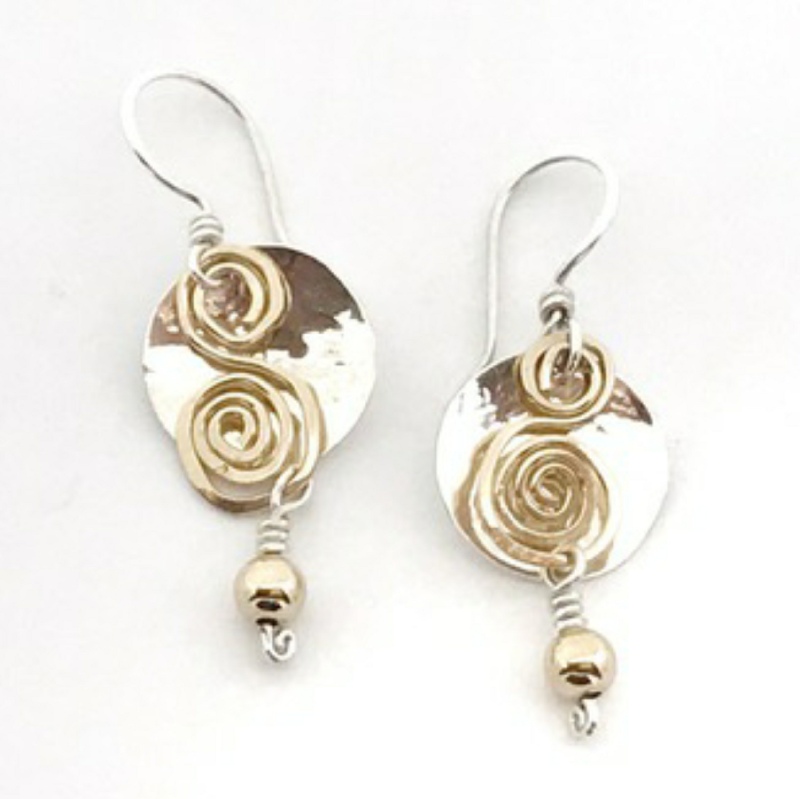 A round hammered ⅝ inch concave sterling silver disc with a 14kt gold-filled attached spiral dangle with a 5-millimeter bead dangle. These are some of Wendy’s most popular sellers. Each pair is handmade and one of a kind.