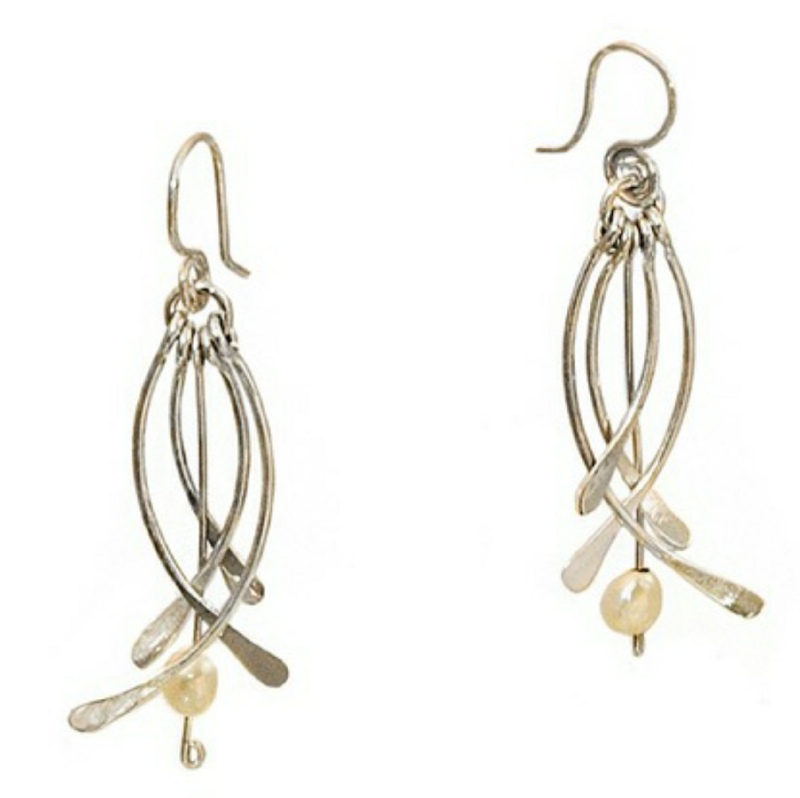 One of the oldest pair of earrings Wendy makes. She hammers measured out, and curled pieces of sterling silver wire, and puts them together in a pattern with the center being a 5-millimeter dangle bead.
